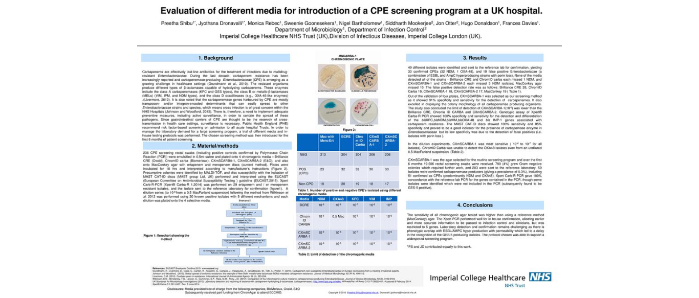 Shibu P, Dronavalli J, Rebec M, Goonesekera S, Mookerjee S, Otter JA, Donaldson H, Davies F. Evaluation of different media for introduction of a CPE screening program at a UK hospital. European Congress of Clinical Microbiology and Infectious Diseases (ECCMID), Amsterdam, The Netherlands, 9-12 April 2016.